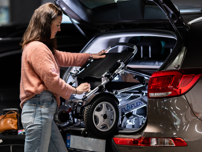 De Eloflex past in alle soorten auto's. Nu kunt u met een vriend reizen, een gewone taxi nemen of een auto huren zonder u zorgen te maken over gedoe met uw elektrische rolstoel. Dankzij het lage gewicht kunt u hem gemakkelijk in uw eigen auto laden.