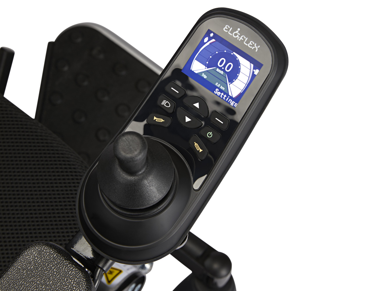 Onze slim ontworpen joystickbevestiging brengt u dichter bij de rand van tafels, wat de toegankelijkheid verbetert. De voetsteun kan gemakkelijk onder de zitting worden geklapt en de grote achterwielen met luchtbanden zorgen voor een comfortabele rit, zelfs op oneffen terrein. Met standaard twee accu's en ruimte voor een derde, is de actieradius tot 45 km ofwel tot 7,5 uur rijden op één acculading.