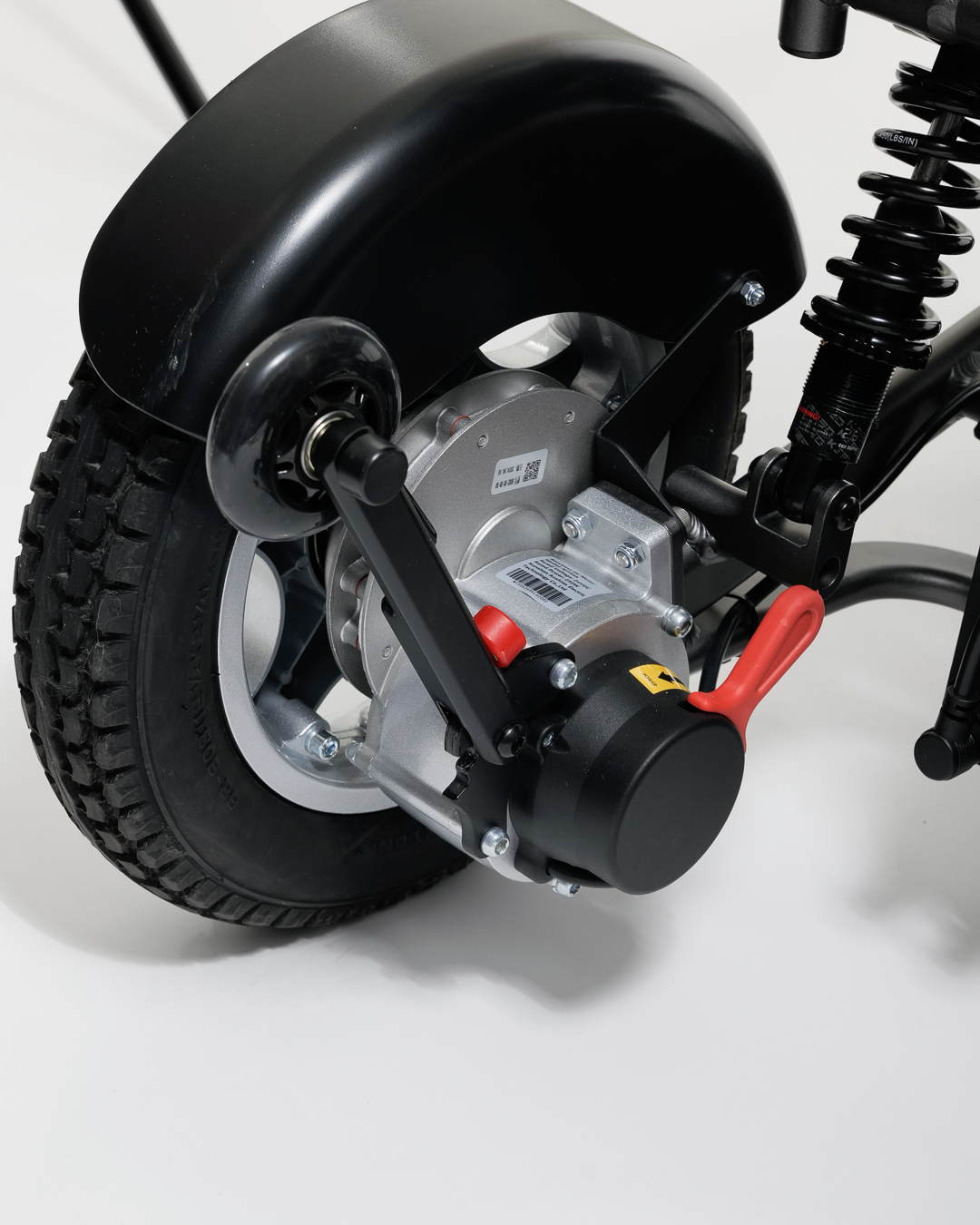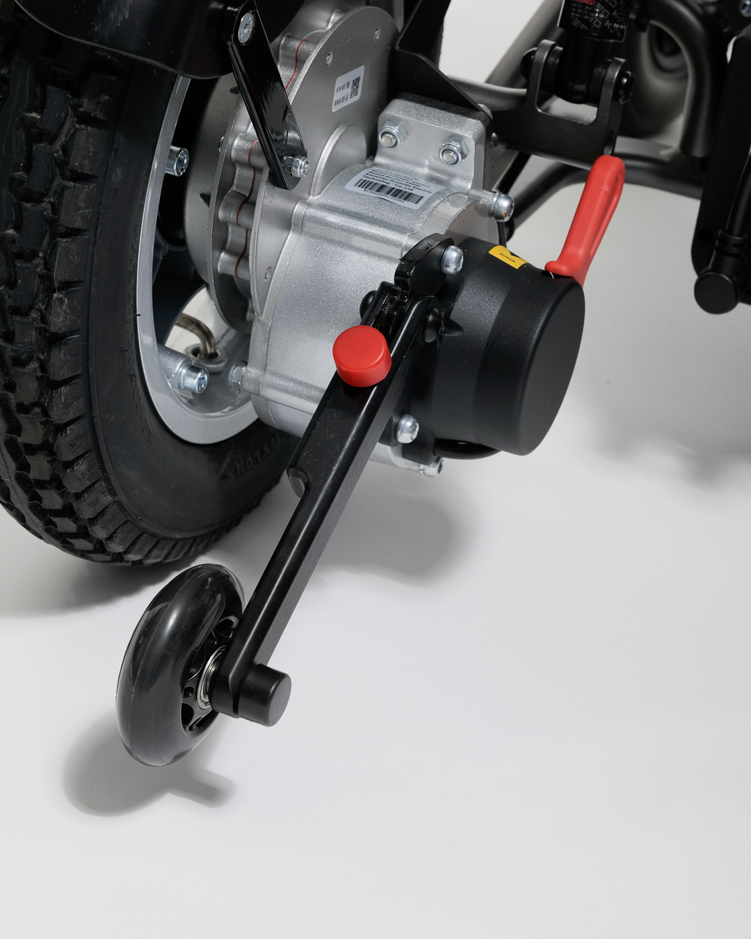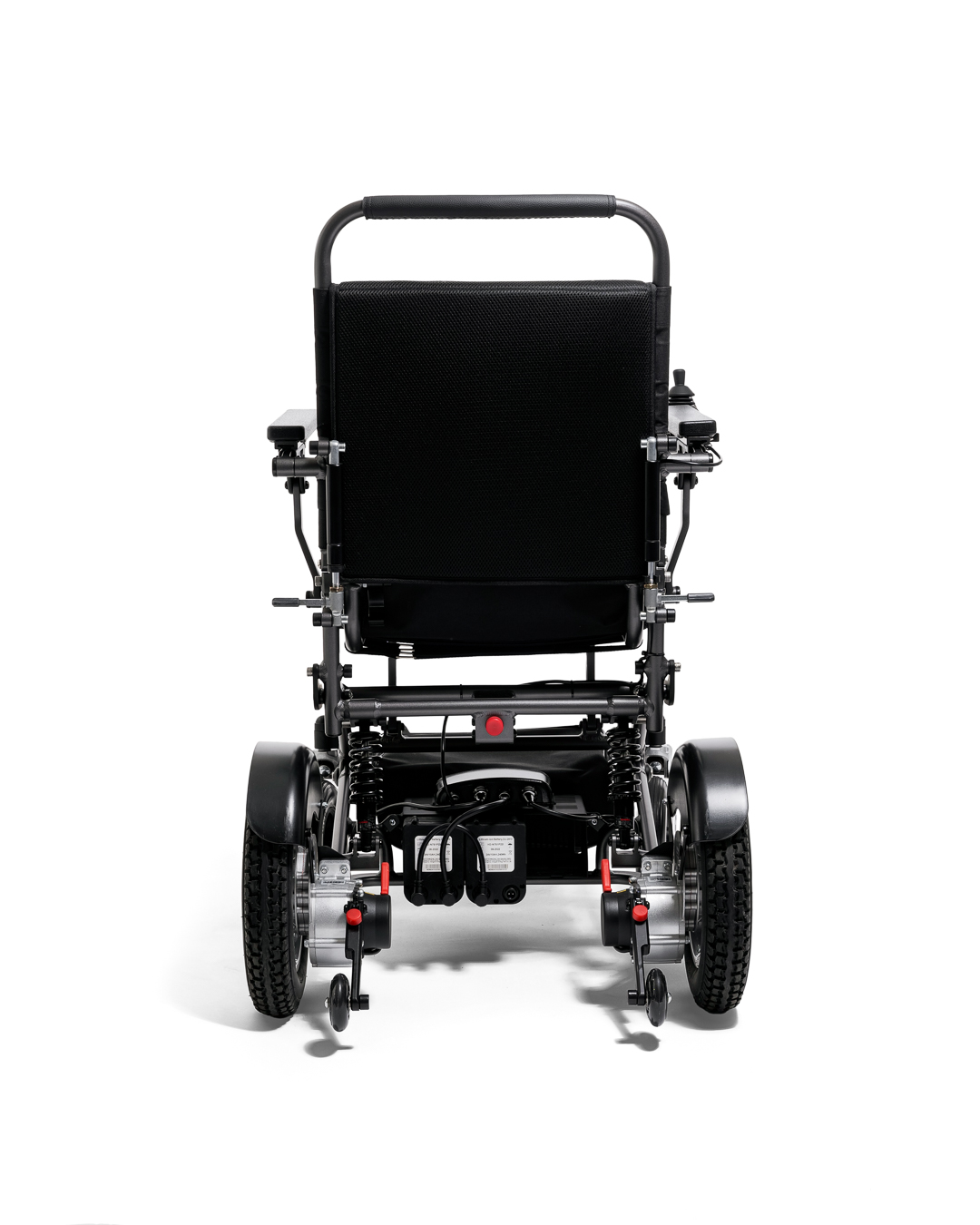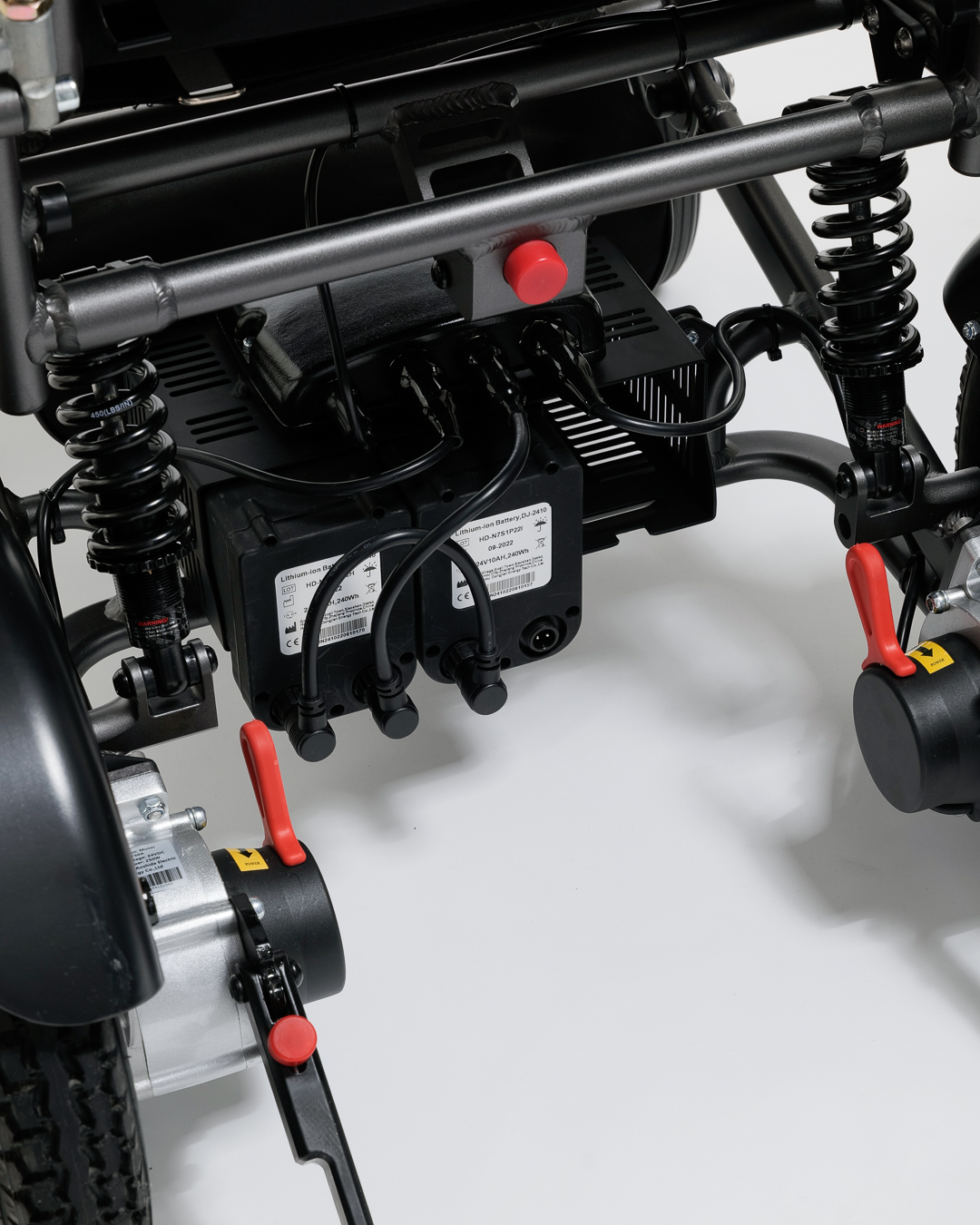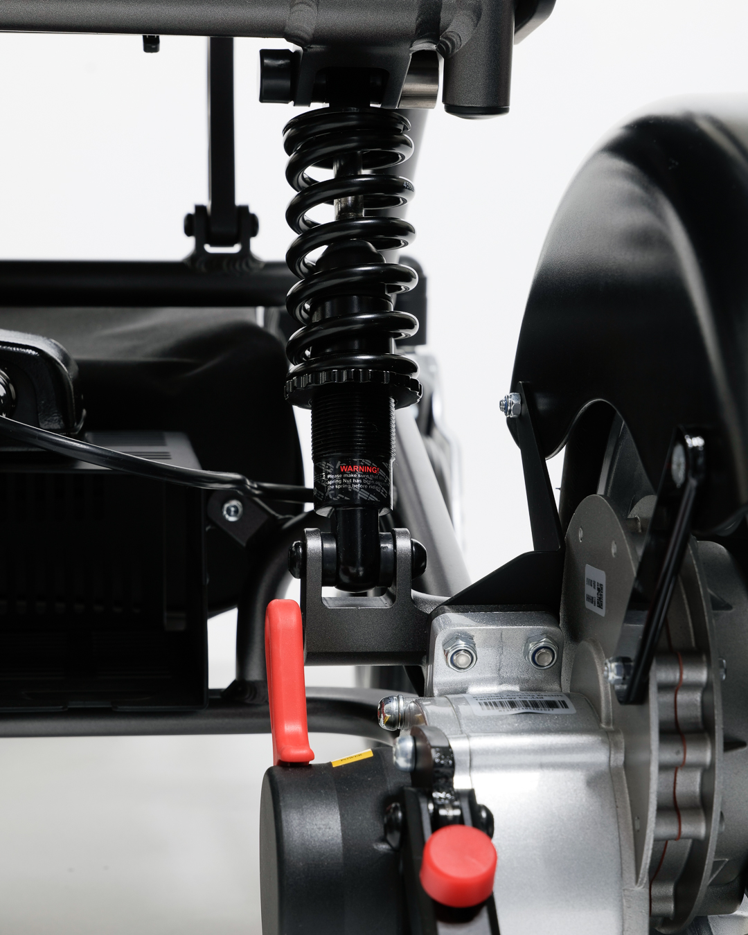 Met vering op alle vier de wielen en efficiënte demping op de achterwielen zorgt deze stoel voor een soepele en comfortabele rit. De rijkwaliteit wordt verder verbeterd door het speciaal ontworpen stijve en stevige chassis.