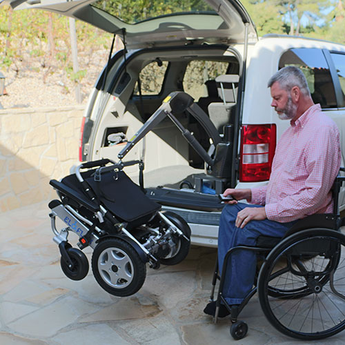 Voor een handige maar iets duurdere oplossing kunt u overwegen om een rolstoellift in de kofferbak van uw auto te installeren om het laden van Eloflex te vergemakkelijken. Dit is de beste oplossing als u in een rolstoel zit en uw Eloflex zelfstandig in de auto wilt kunnen vervoeren. Er zijn talloze liftoplossingen en -modellen op de markt, maar gezien het compacte, lichtgewicht ontwerp van uw Eloflex is een vrij eenvoudige rolstoellift vaak voldoende. We raden u aan contact op te nemen met de dichtstbijzijnde auto-inbouwshop voor meer informatie en advies.