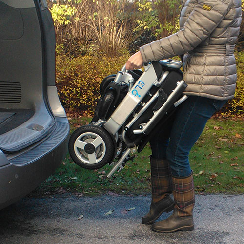 Een methode met een lagere greep voor kortere mensen. Gebruik de wielen om de stoel in de kofferbak van de auto te rollen en zorg ervoor dat u de motoren uitschakelt voordat u hem optilt.